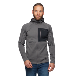 From summer rock routes in the Sierra to tedious ice leads in the heart of winter, the Black Diamond Factor Hoody delivers four-season, technical midlayer performance in a light, stretchy and quick-drying package. The hoody’s close-fitting, under-the helmet hood helps retain warmth on chilly approach pitches and lets you leave the beanie at home, while zippered hand and chest pockets secure small on-route essentials.